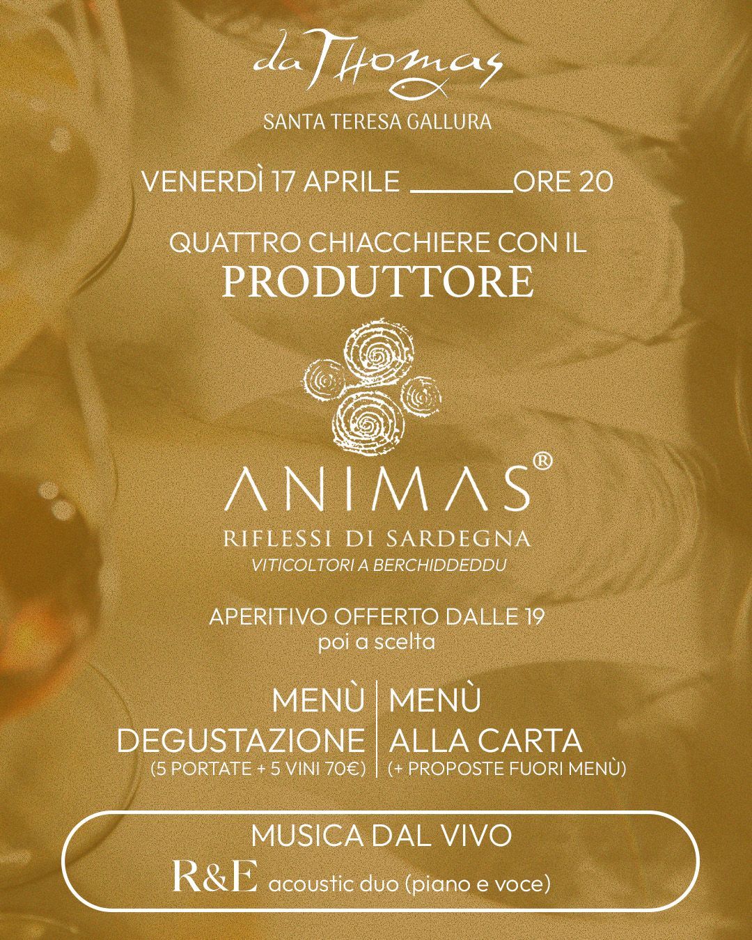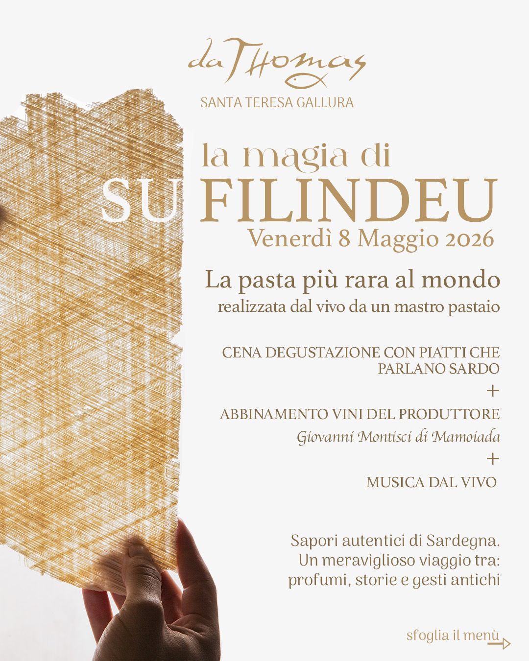 il mastro pastaio Luca Floris lavorerà i "fili di Dio" a dimostrazione dell'artigianalità e della magia di questa pasta delle antiche origini. Il menù degustazione della serata sarà in abbinamento ai vini del produttore Giovanni Montisci, viticoltore di Mamoiada con i suoi vini fatti come una volta, premiati dalla critica gastronomica